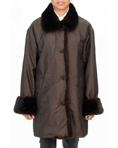 REF. CHN120 Gabardina con sobrevista, interior del cuello y puño doble de visón La gabardina es marrón oliva, y el visón es marrón oscuro...