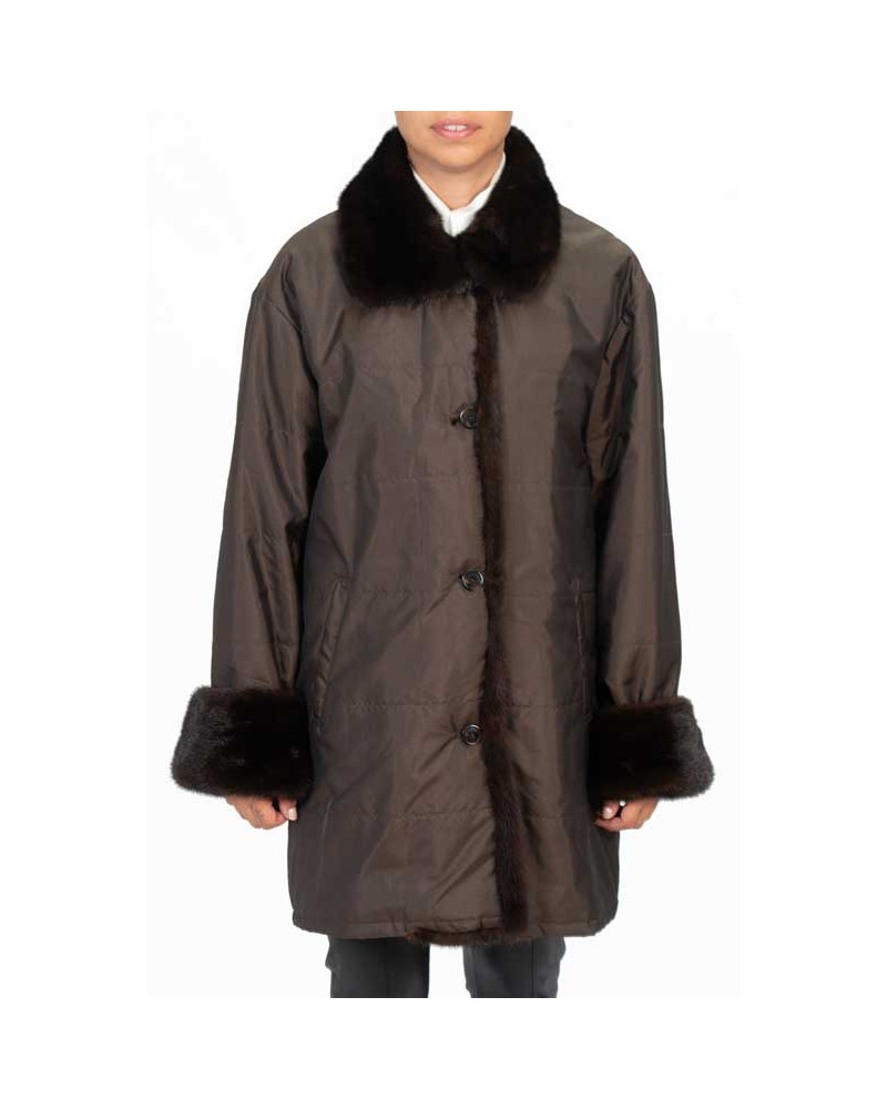 La gabardina es marrón oliva, y el visón es marrón oscuro